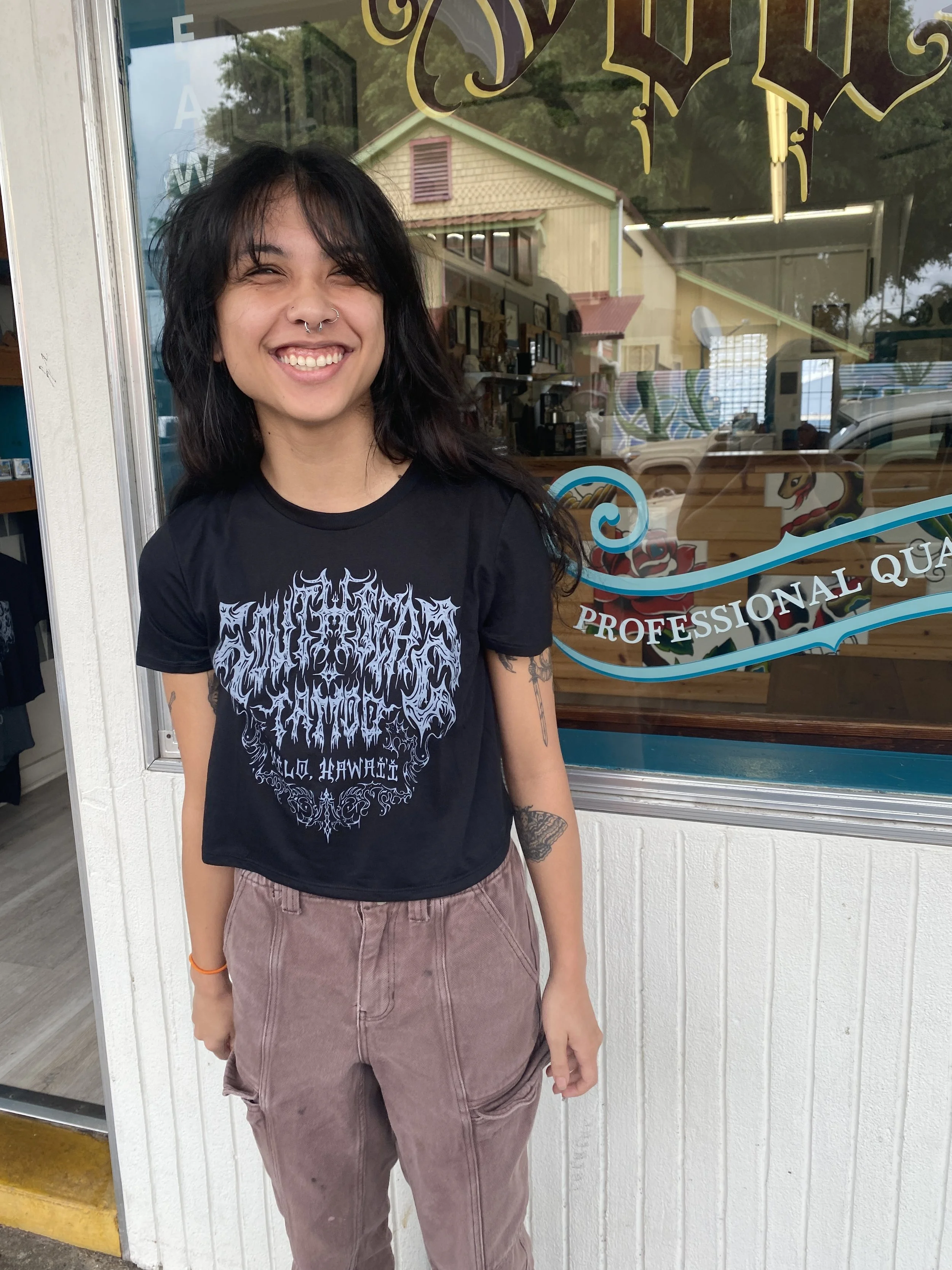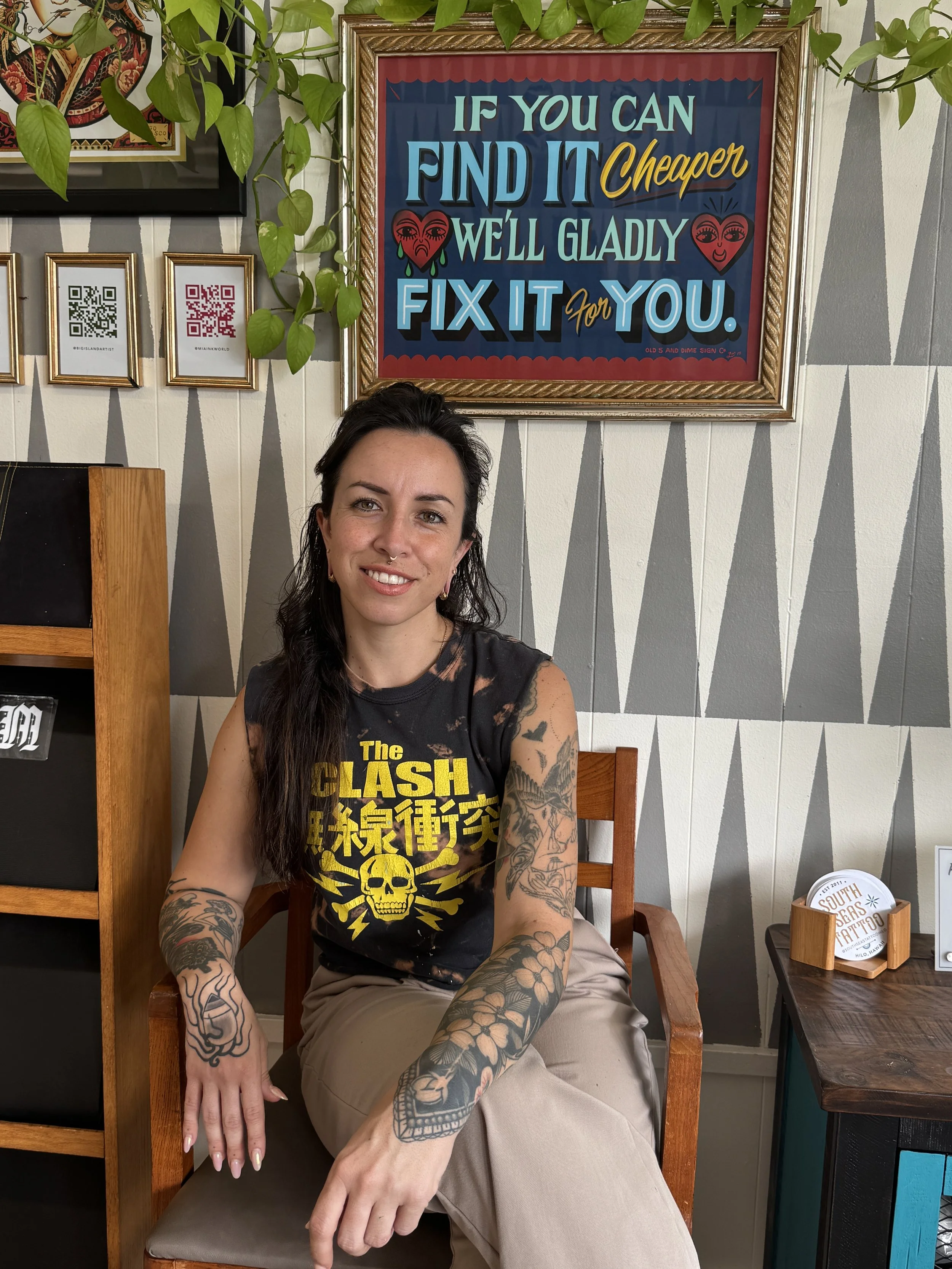 Mia Lum is Hilo side born and raised. She has spent her entire life drawing and creating, which naturally lent itself to a career in tattooing. Mia started her apprenticeship in 2021 at South Seas and quickly became a full-time tattooer. While she can tattoo in a variety of styles, she excels at black and grey fine-line and engraving styles. Mia’s work highlights botanicals, animals, insects, oddities and the occasional medieval weapon.